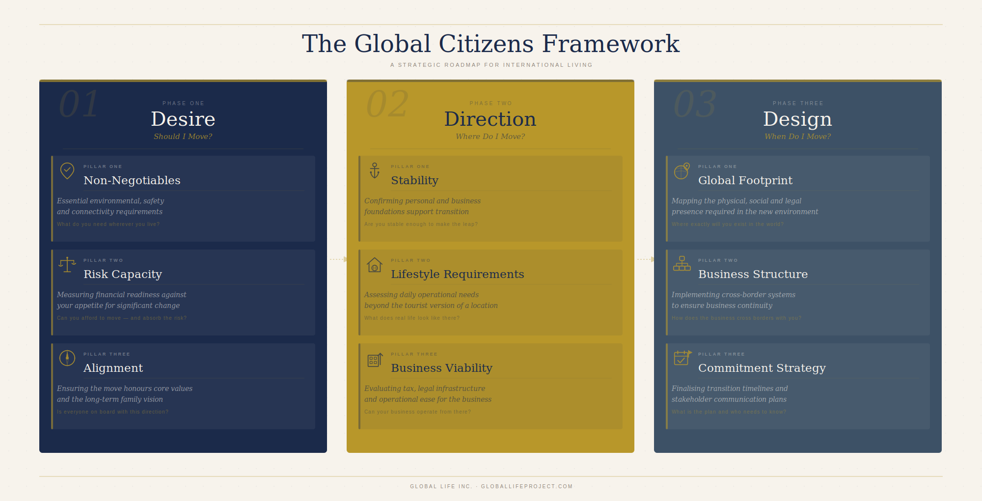 Phase 3 is DESIGN: It answers the questions, When and how do I move? This is the execution phase. Global footprint, business structure, legal and tax considerations, the commitment strategy, and the timeline. This is where decisions become plans.
