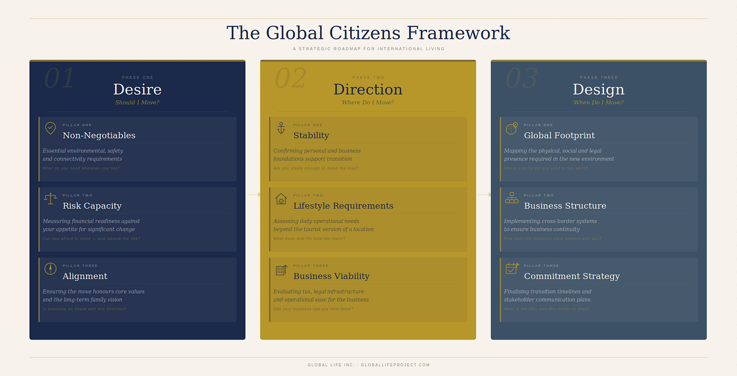 I’m an operator who has spent 14 years building businesses and helping others build theirs, and who has been living the global decision in real time since 2015. I have moved with a newborn. I have reversed a move because it wasn’t working for my child. I have rebuilt my business structure across three different regulatory environments. I have made this decision badly and well, and I know the difference.