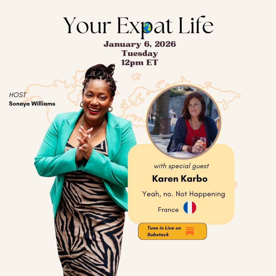On this episode of Your Expat Life LIVE, host Sonaya Williams sits down with Karen Karbo of Yeah, no. Not Happening. Karen shares her unapologetic journey of leaving the U.S., settling into life in France, and redefining what it means to live authentically as a woman abroad.